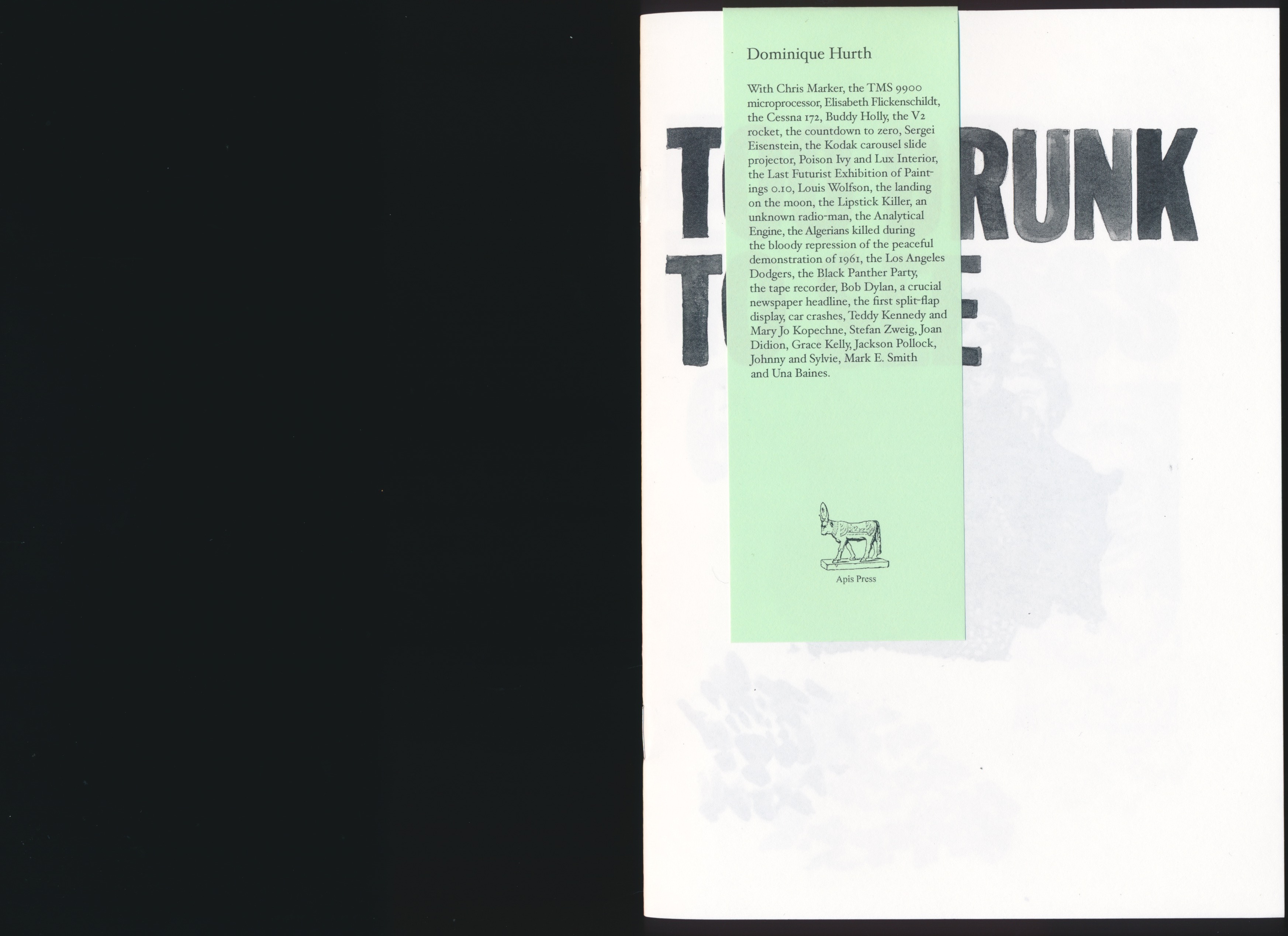 With Chris Marker, the TMS 9900 microprocessor, Elisabeth Flickenschildt, the Cessna 172, Buddy Holly, the V2 rocket, the countdown to zero, Sergei Eisenstein, Poison Ivy and Lux Interior, the Last Futurist Exhibition of Paintings 0.10, Louis Wolfson, the landing on the moon, the Lipstick Killer, an unknown radio-man, the Analytical Enine, the Algerians killed during the bloody repression of the peaceful demonstration of 1961, the Los Angeles Dodgers, the Black Panther Party, the tape recorder, Bob Dylan, a crucial newspaper headline, the first split-flap display, car carshes, Teddy Kennedy and Mary Jo Kopechne, Stefan Zweig, Joan Didion, Grace Kelly, Jackson Pollock, Johnny and Silvie, Mark E. Smith and Una Baines.